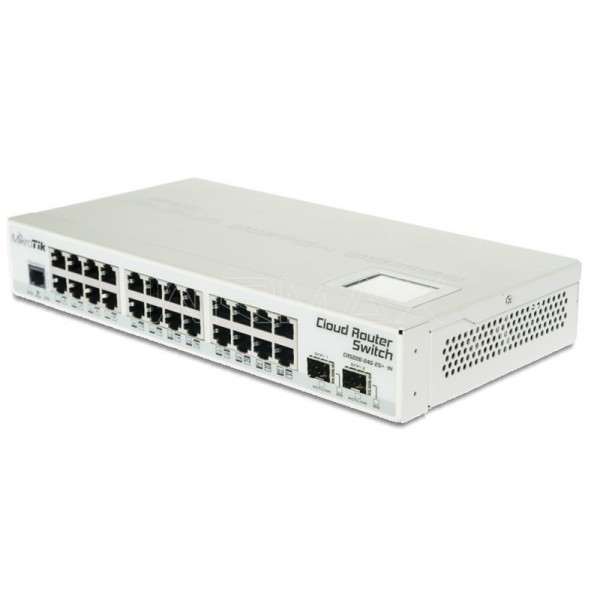 24x Gigabit Ethernet layer 3 Smart Switch, 2x SFP+ cages, LCD, 400MHz CPU, 64MB RAM, Metal desktop case, RouterOS L5