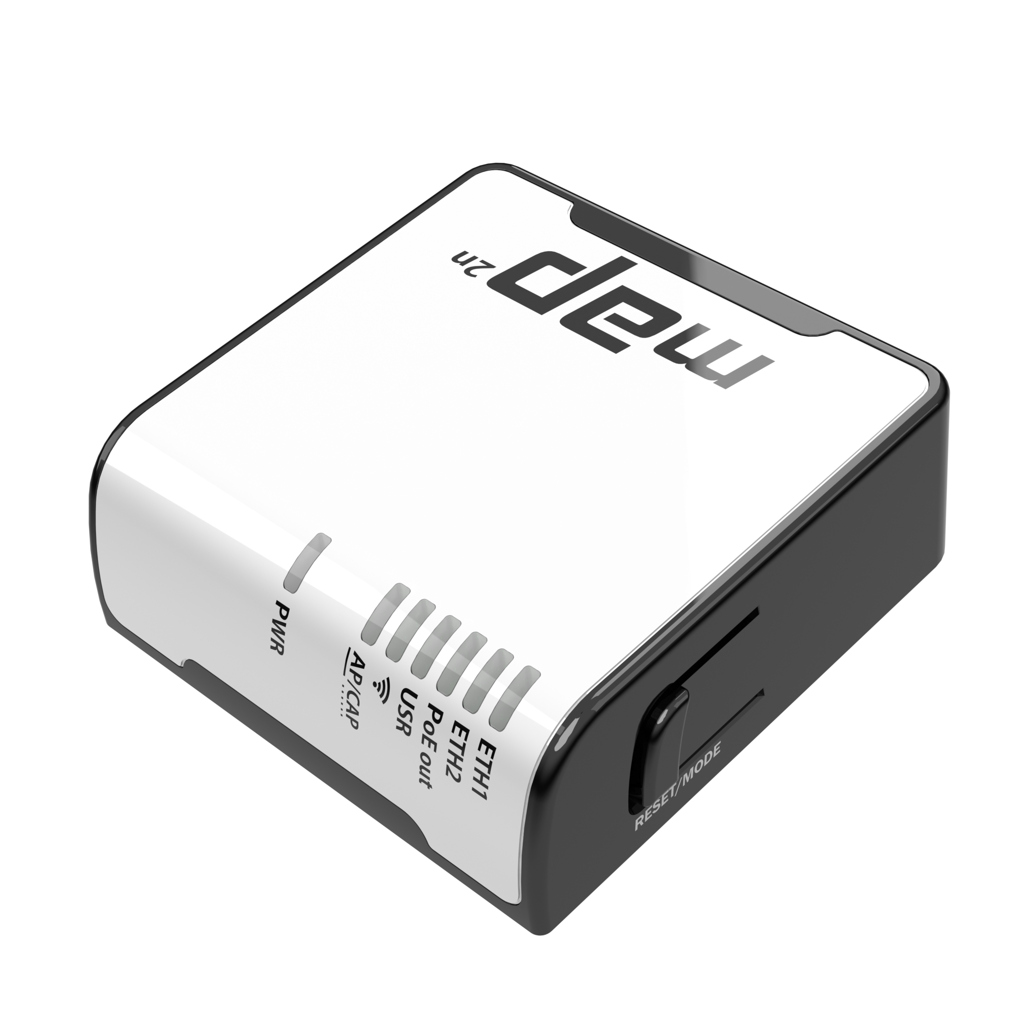 The mAP (micro Access Point) is a tiny size wireless 2.4GHz Access Point with full RouterOS capabilities. It is very portable, since It also works as a PoE injector - the second Ethernet port provides up to 500mA of power to another device