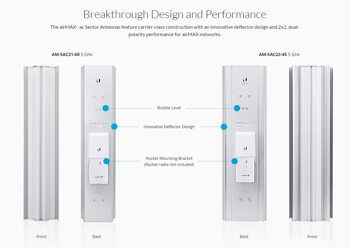 The airMAX® ac Sector Antennas feature carrier-class construction with an innovative deflector design and 2x2, dual-polarity performance for airMAX networks.