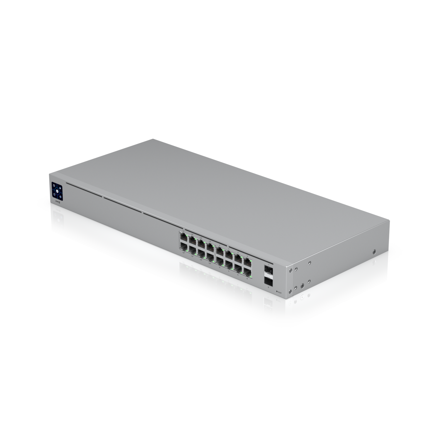 A 16-port, Layer 2 PoE switch with a silent, fanless cooling system.