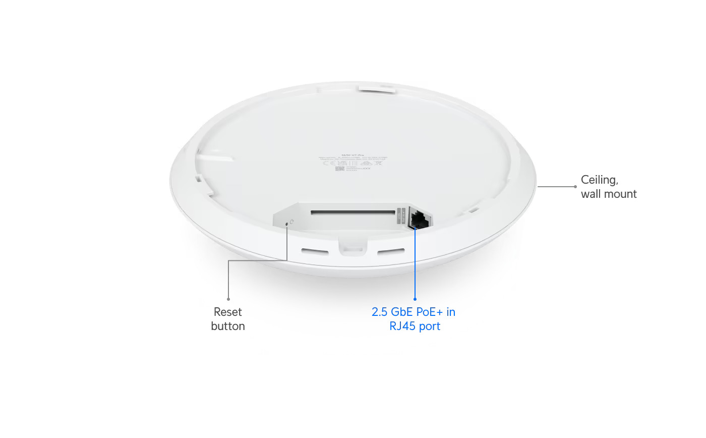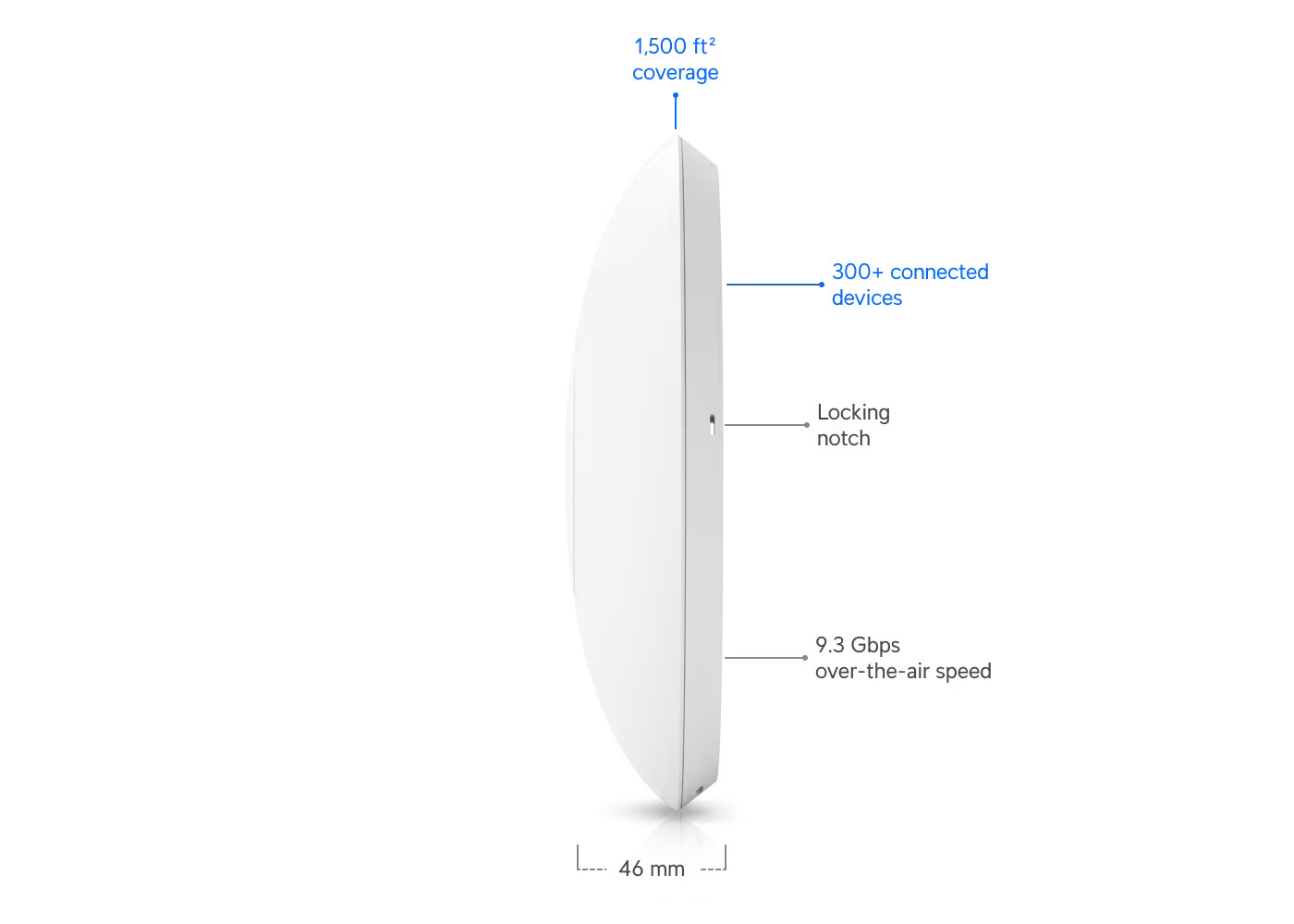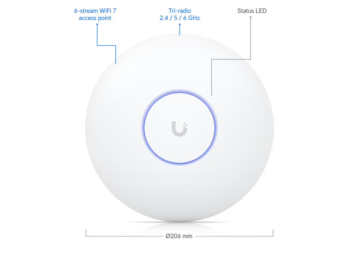 Ceiling-mounted WiFi 7 AP with 6 spatial streams and 6 GHz support for interference-free WiFi in demanding, large-scale environments.