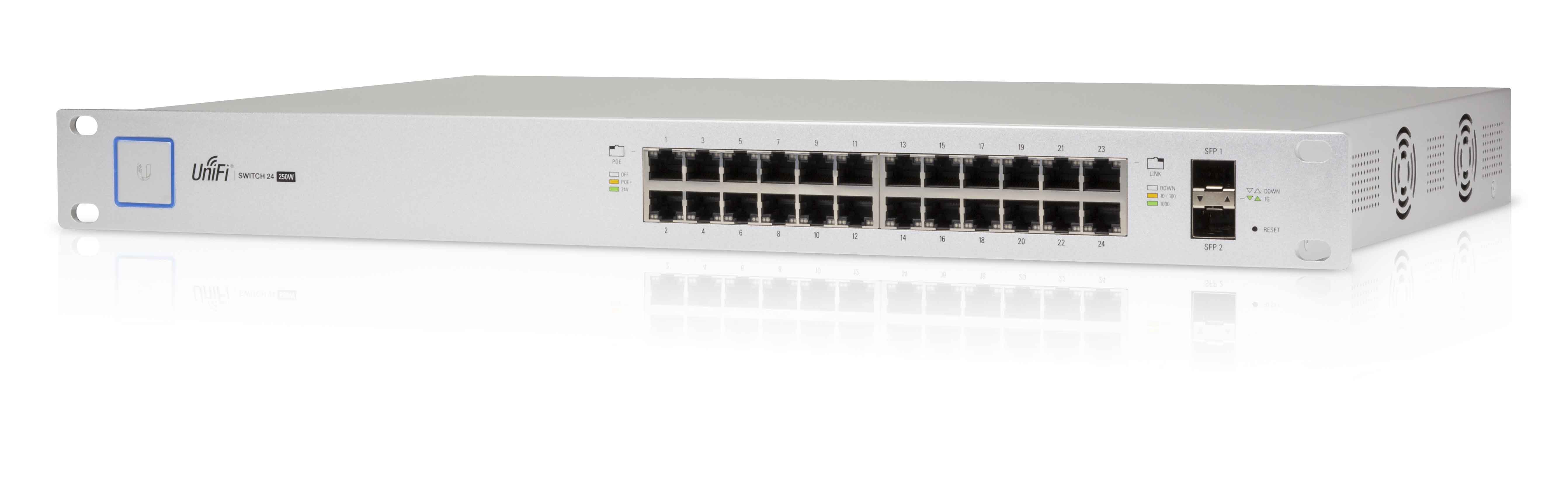 This Ubiquiti Networks UniFi Switch US-24-250W is 24-Port, Managed PoE+ Gigabit switch with 26Gbps non-blocking throughput switching performance, Gigabit Ethernet RJ45 and SFP+ and SFP Ports and Auto-Sensing IEEE 802.3af/at PoE.