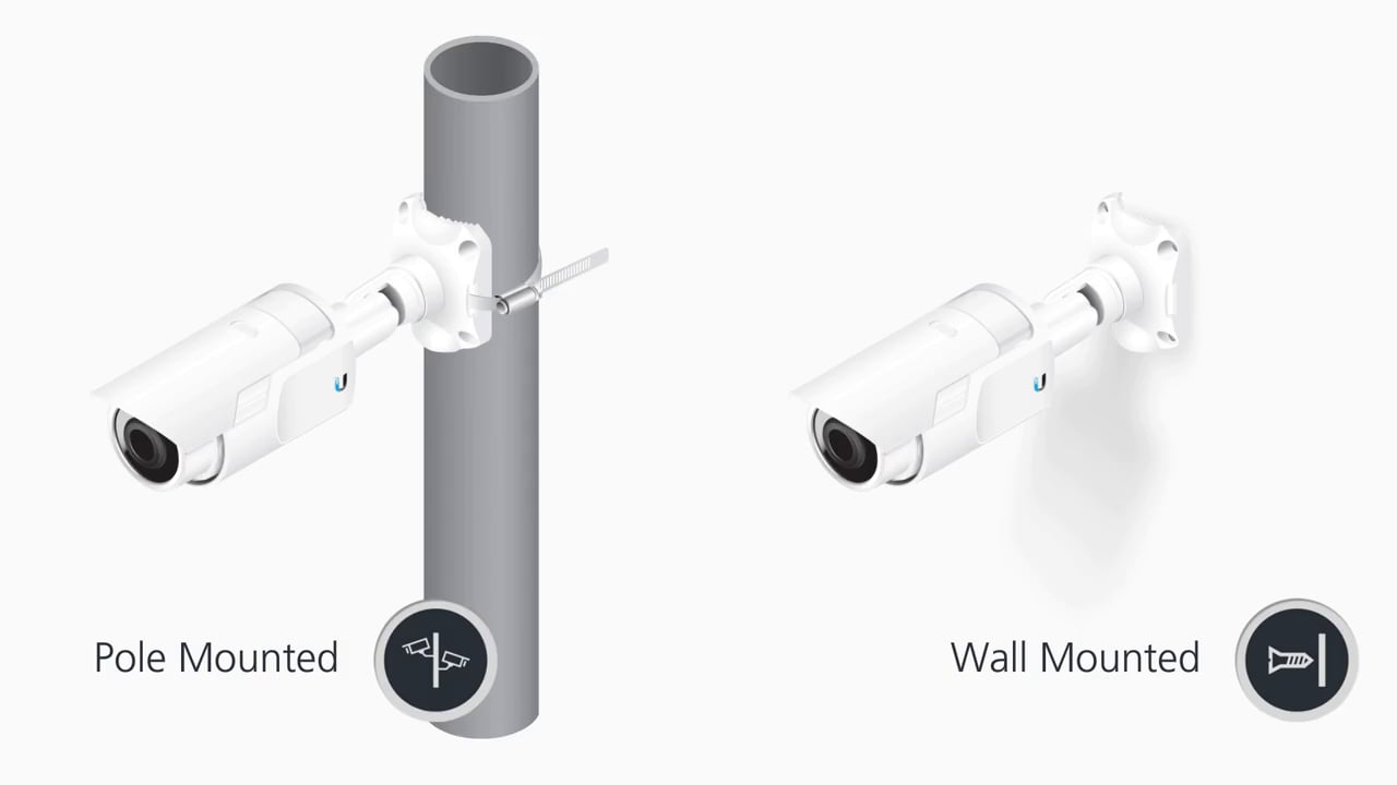 The UniFi Video Camera offers aiming flexibility and can be mounted quickly on a wall, ceiling, or pole.